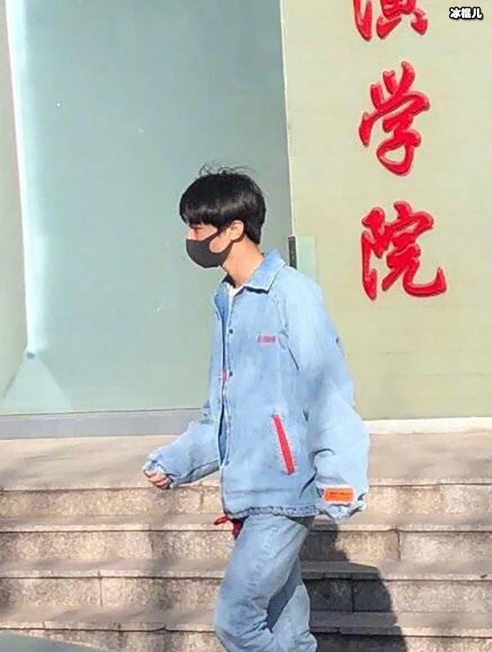 这次王俊凯被拍到从电影学院大楼走出来,一身牛仔装,搭配白色T恤和白色球鞋,戴着口罩,似乎怕被别人认出来,看起来非常低调。