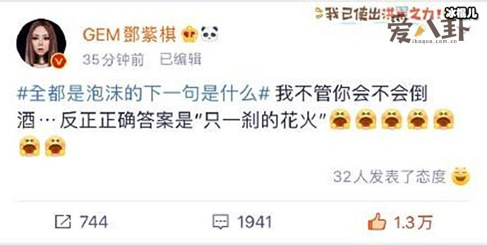 邓紫棋当年在《我是歌手》的舞台上凭借一首原创歌曲《泡沫》迅速走红,让更多大陆的网友认识了这位来自中国香港的铁肺歌手,其中泡沫当中的一句歌词”全都是泡沫,一刹那花火“被人们广为传唱,不过随之而来的便是恶搞,如全都是泡沫下一句是“你会不会倒酒啊”!